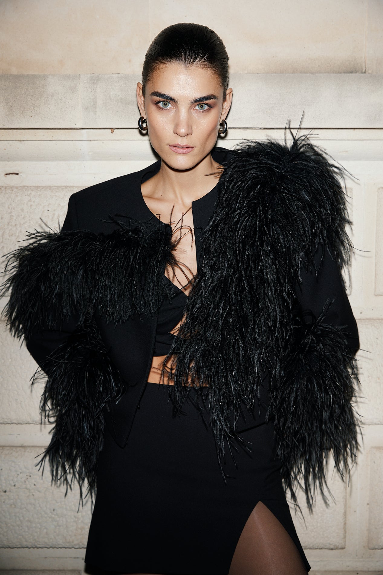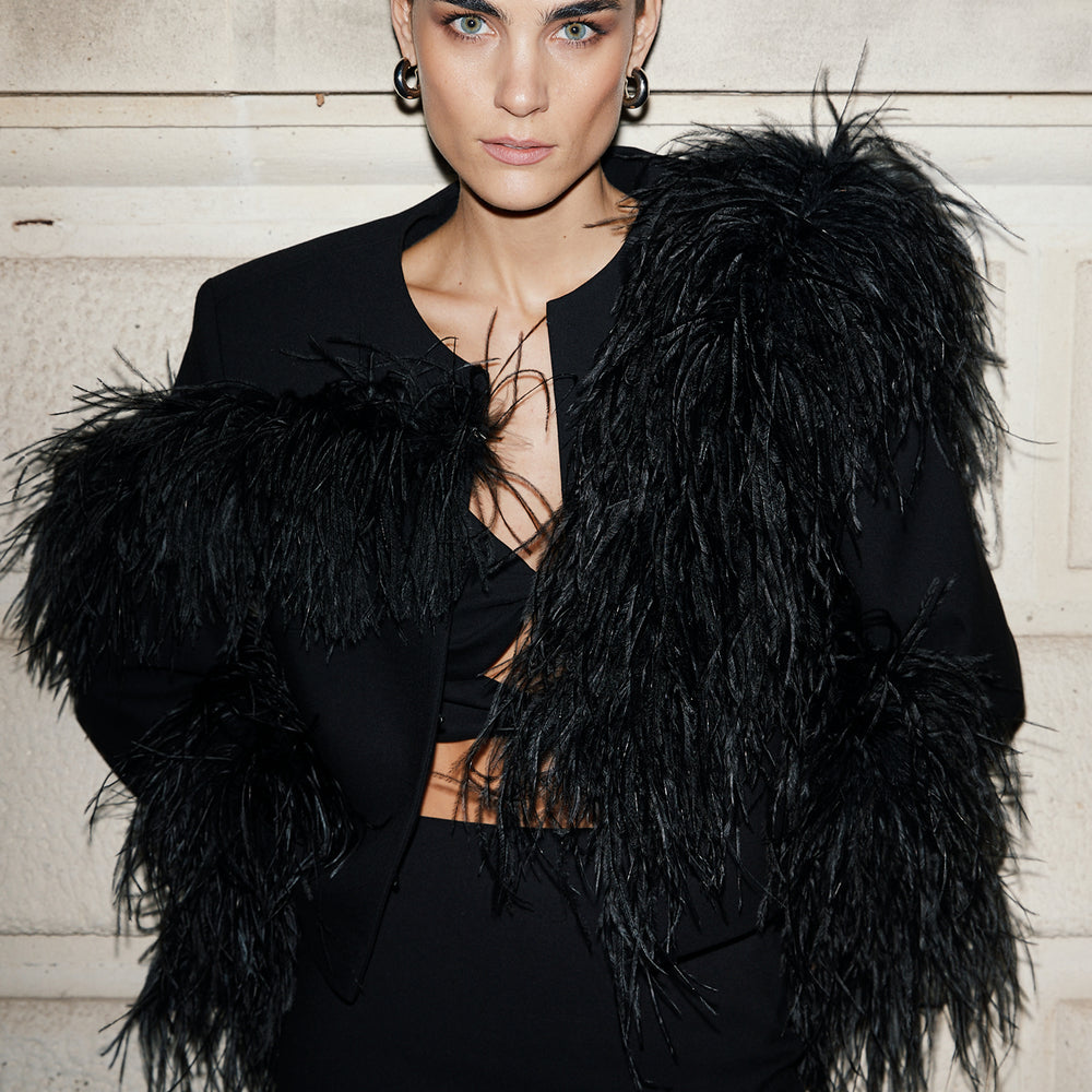 An ode to vintage glamour, this statement Couture Jacket is crafted from luxurious black crepe and adorned with fluffy ostrich feathers that elegantly sway with every step. The oversized fit and cropped shape create a flattering silhouette, making this jacket a dream come true for those who love to make a bold fashion statement. Pair it with the matching Couture Mini skirt or Couture Maxi skirt for a stunning and cohesive look. This is truly a piece that exudes sophistication and style