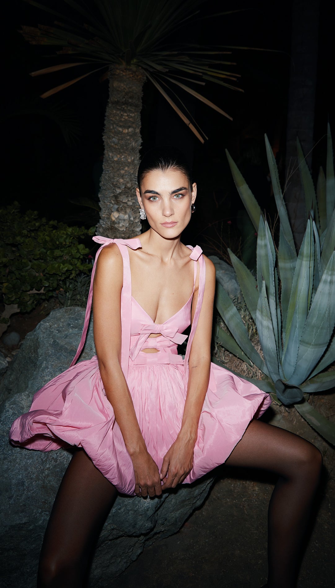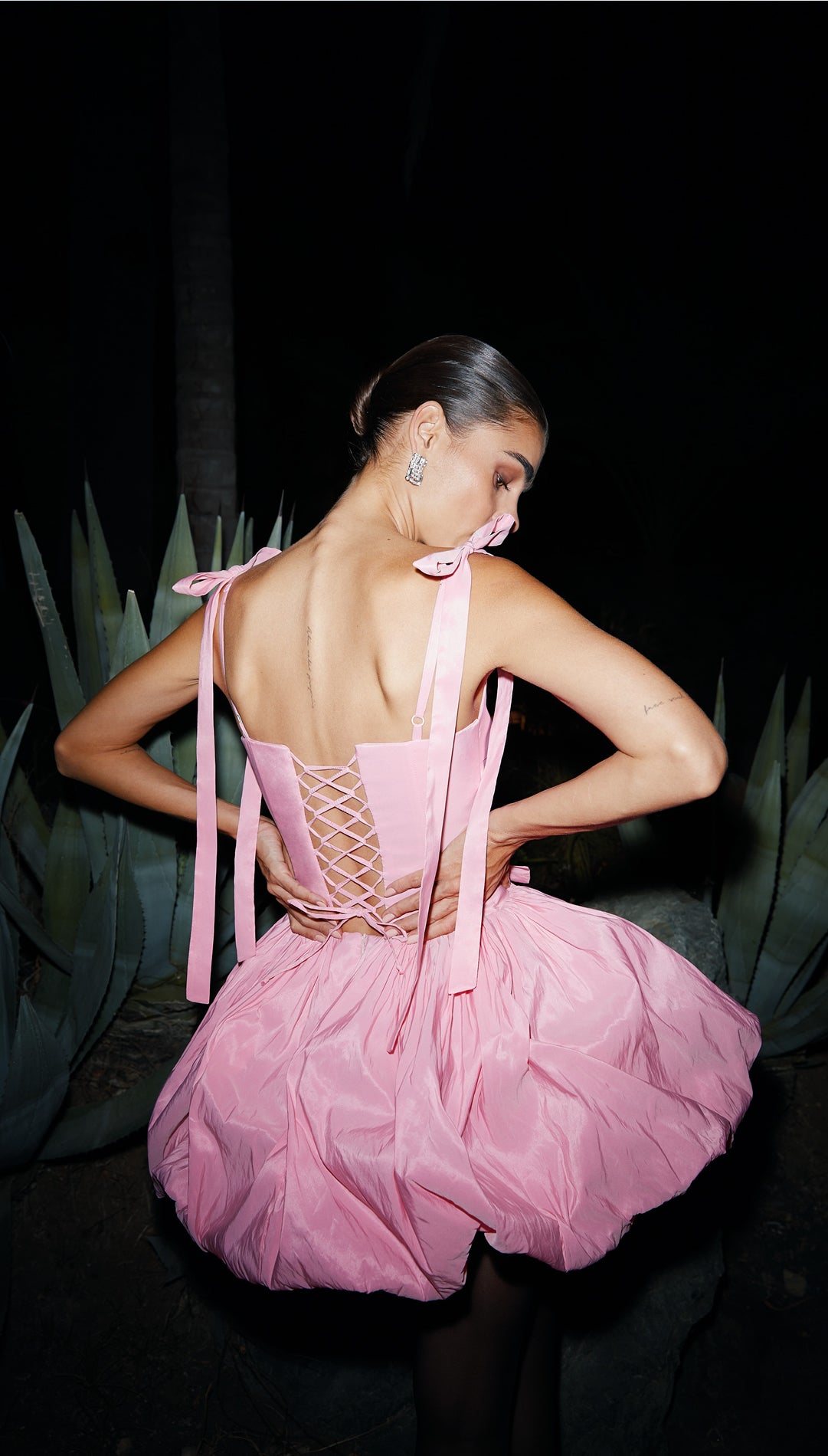 A playful yet refined mini dress in soft blush-pink taffeta, designed for a light, romantic mood. The sculpted bodice flatters the figure, while the voluminous skirt adds movement and charm. Adjustable straps and a lace-up back offer a customizable fit, making it ideal for cocktail parties, celebrations, and evenings with a touch of fairytale elegance.