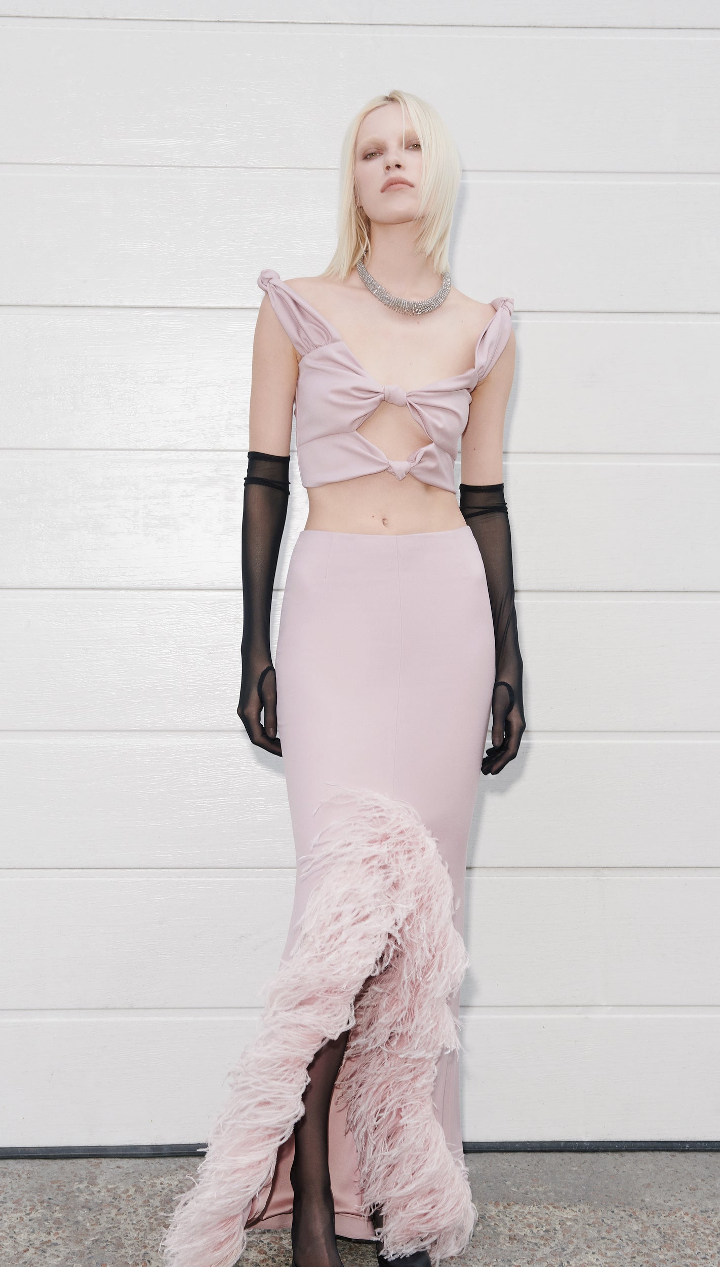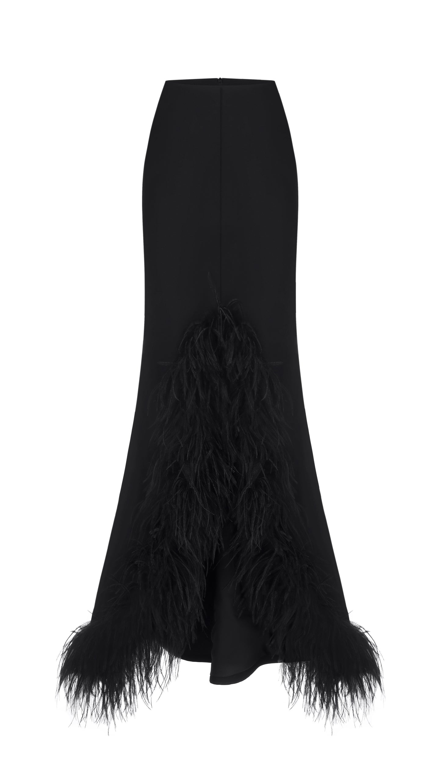 In an ode to vintage glamour, this Swan skirt features exquisite feather embellishments, adding a touch of elegance and sophistication to any outfit. Perfect for special occasions or making a statement, this skirt effortlessly blends timeless style with modern flair. Pair it with Butterfly top for a refined look, or go all out with a bold Swan top for a head-turning ensemble.