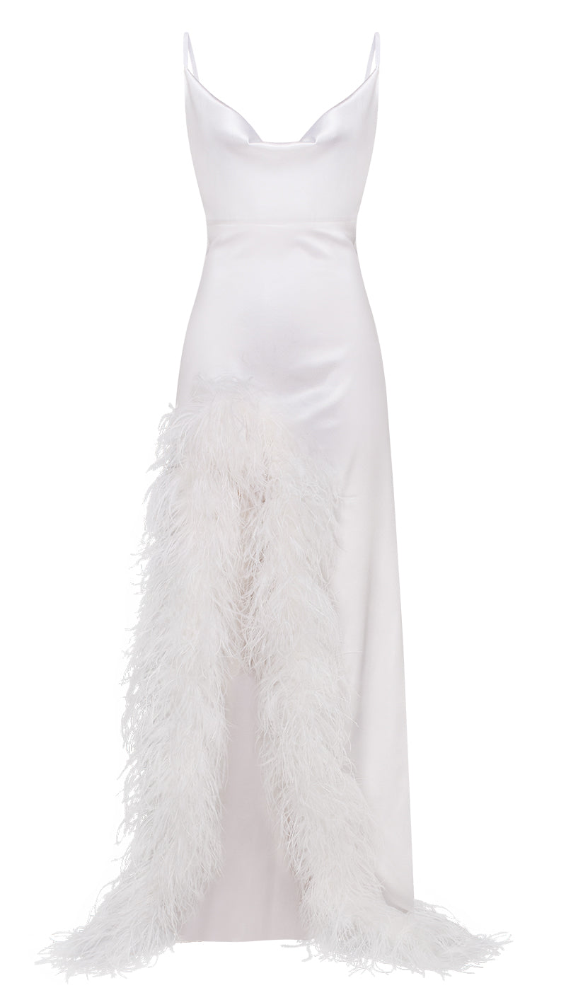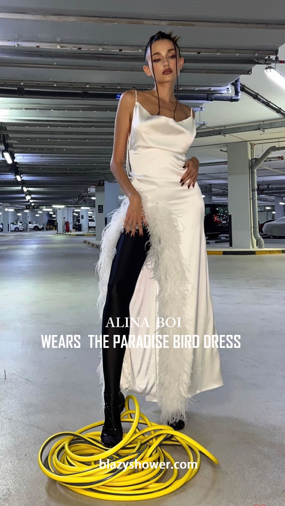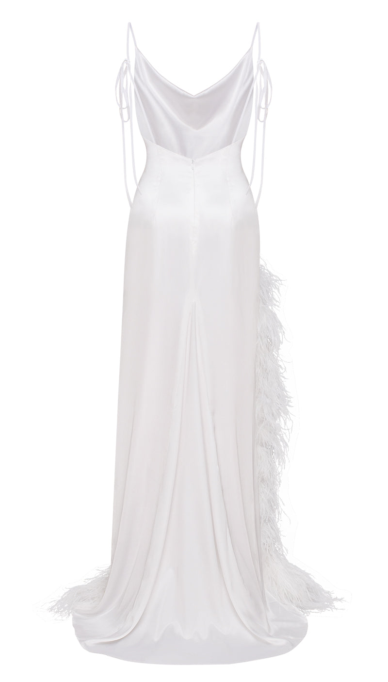 Страусине пір'я та витончений силует цієї сукні гарантують, що всі погляди будуть прикуті до вас, будь то заручини чи вечiрка! Бiлий натуральний шовк, ефектний вирiз, що оголює ногу, увінчаний легким та пишним страусиним пером, що створює відчуття унікальності та драматизму.