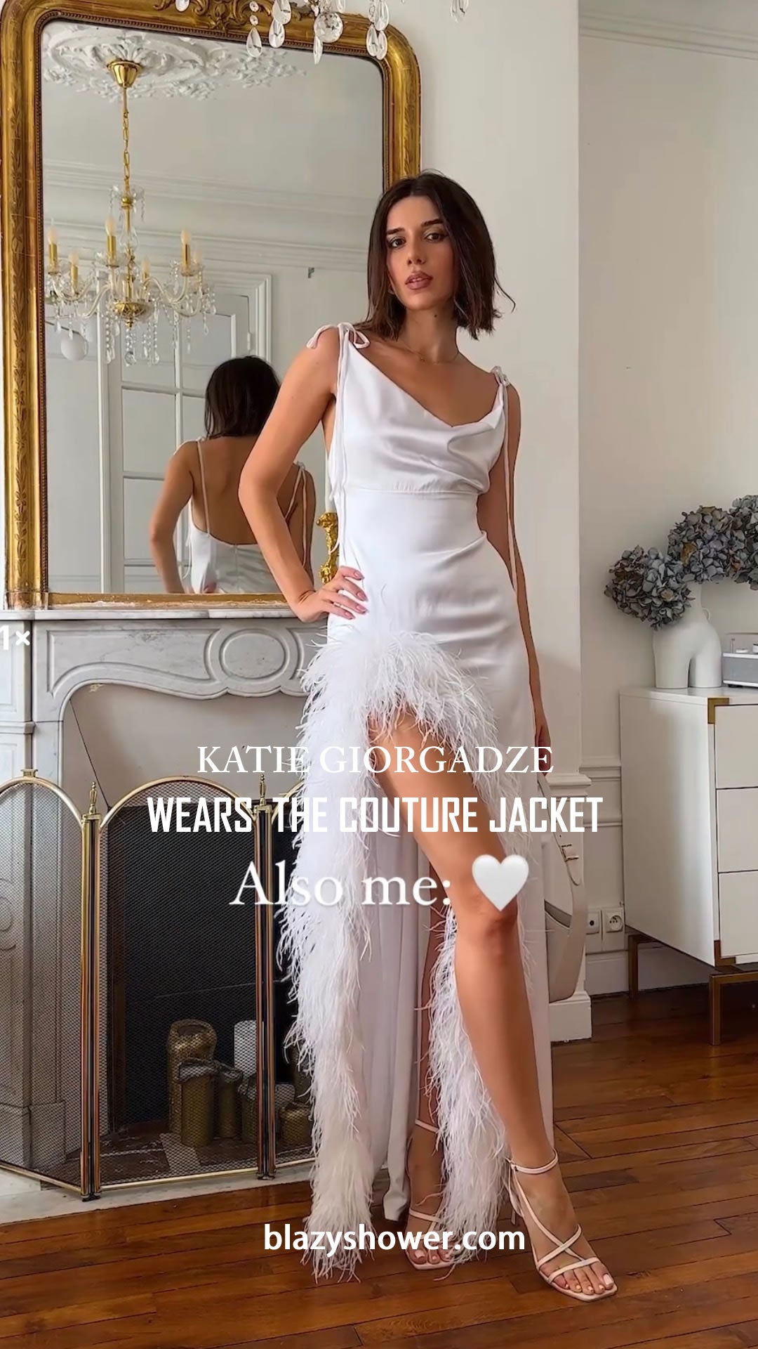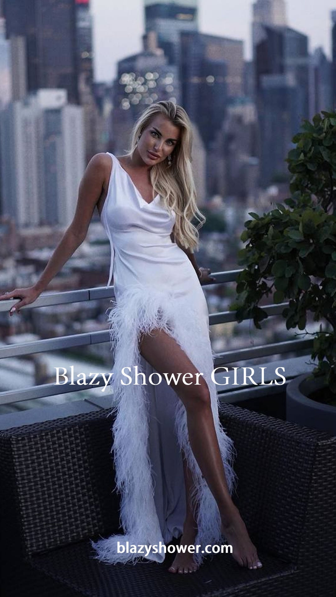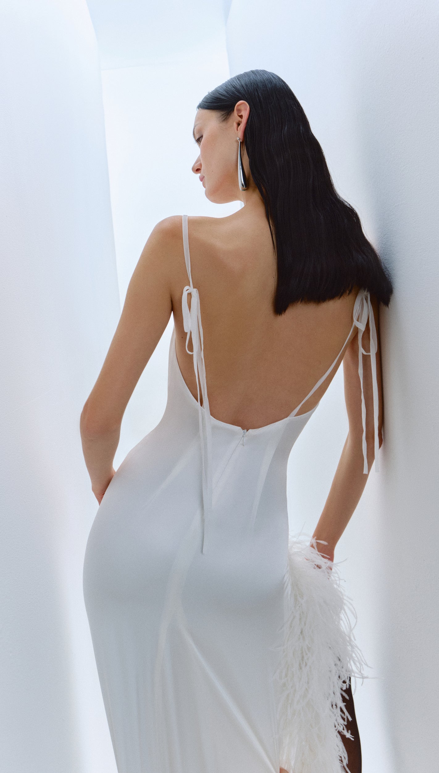 Страусине пір'я та витончений силует цієї сукні гарантують, що всі погляди будуть прикуті до вас, будь то заручини чи вечiрка! Бiлий натуральний шовк, ефектний вирiз, що оголює ногу, увінчаний легким та пишним страусиним пером, що створює відчуття унікальності та драматизму.