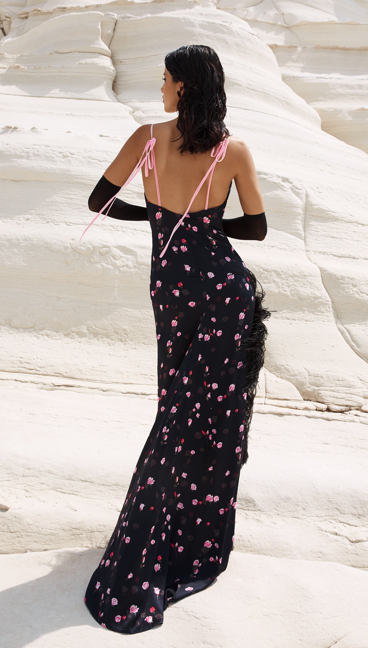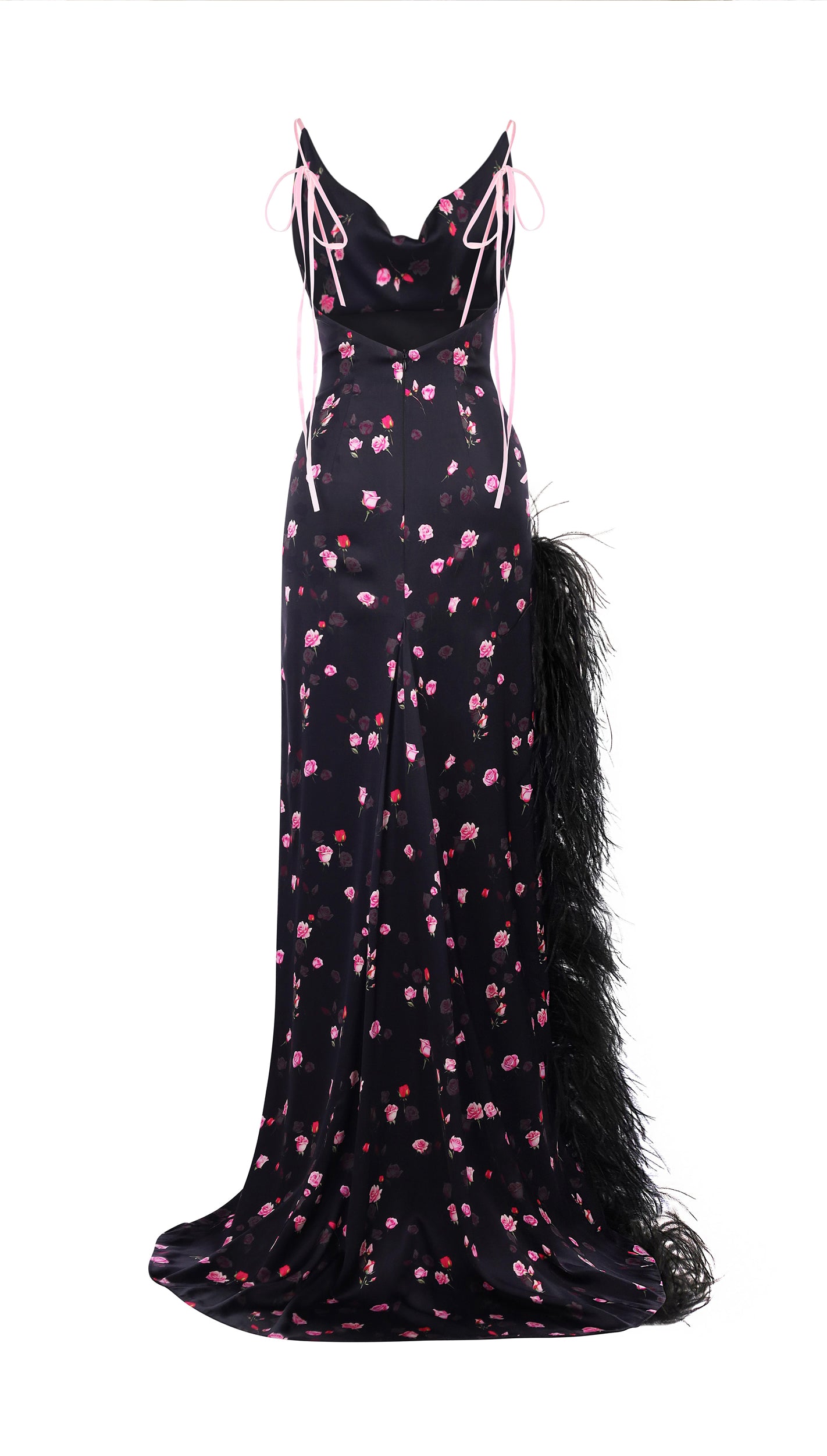 Make a statement in the Black Paradise Rose Dress — where elegance meets edge. Crafted from natural black silk and adorned with deep crimson rose prints, this striking silhouette exudes confidence and mystery. The soft feathered boa detail adds bold texture, creating contrast and allure. Perfect for evening affairs, rooftop events, or when you want to channel unapologetic glamour with a romantic twist.