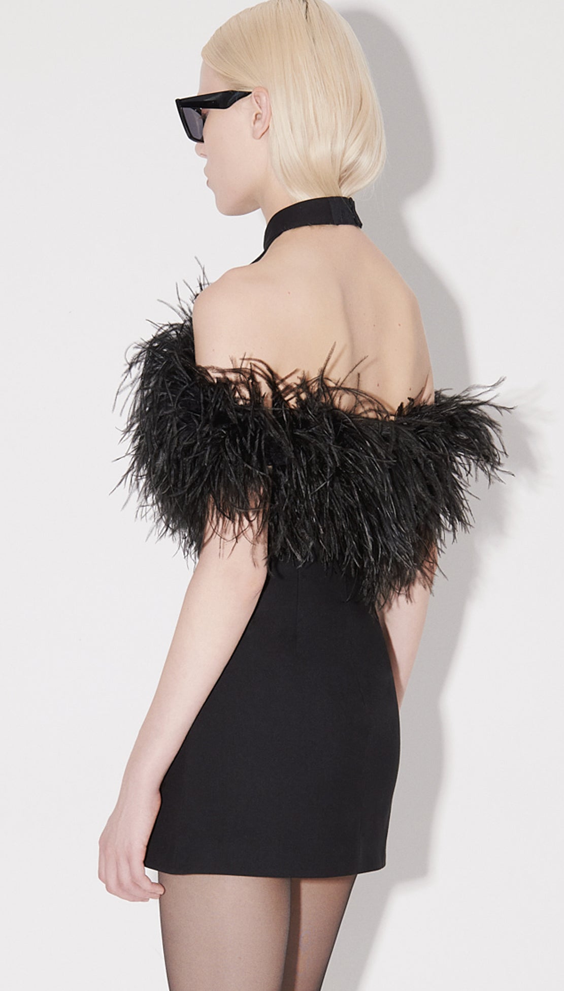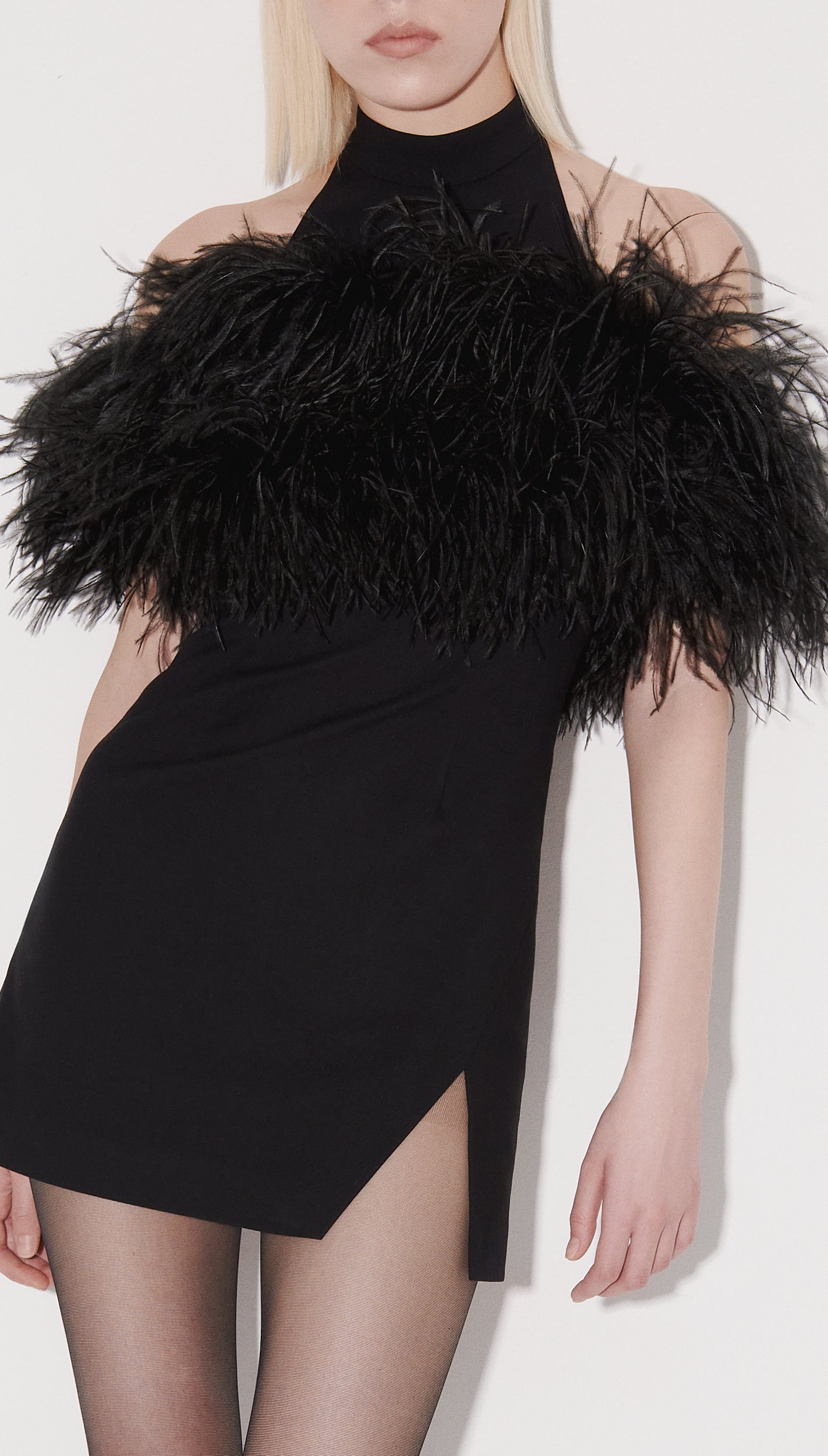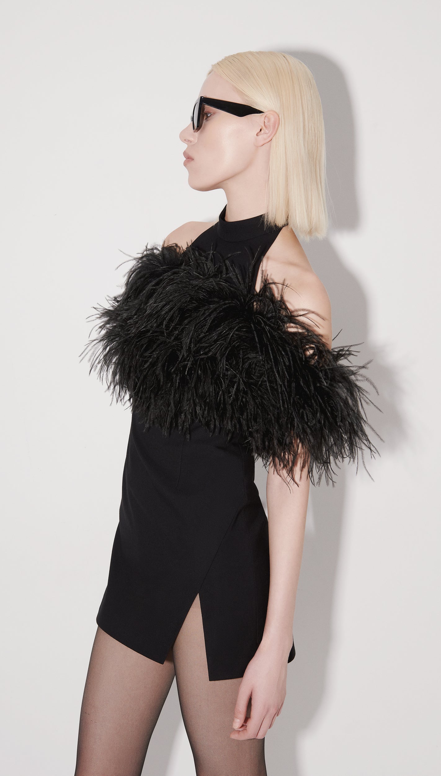 Сукня Swan Mini виготовлена з чорного крепу та прикрашена ніжними, легкими пір'ями вздовж лінії плечей, додаючи образу ноту вишуканості. Це справді ефектний вибір для будь-якого вечірнього виходу, який підкреслить вашу елегантність та приверне увагу!