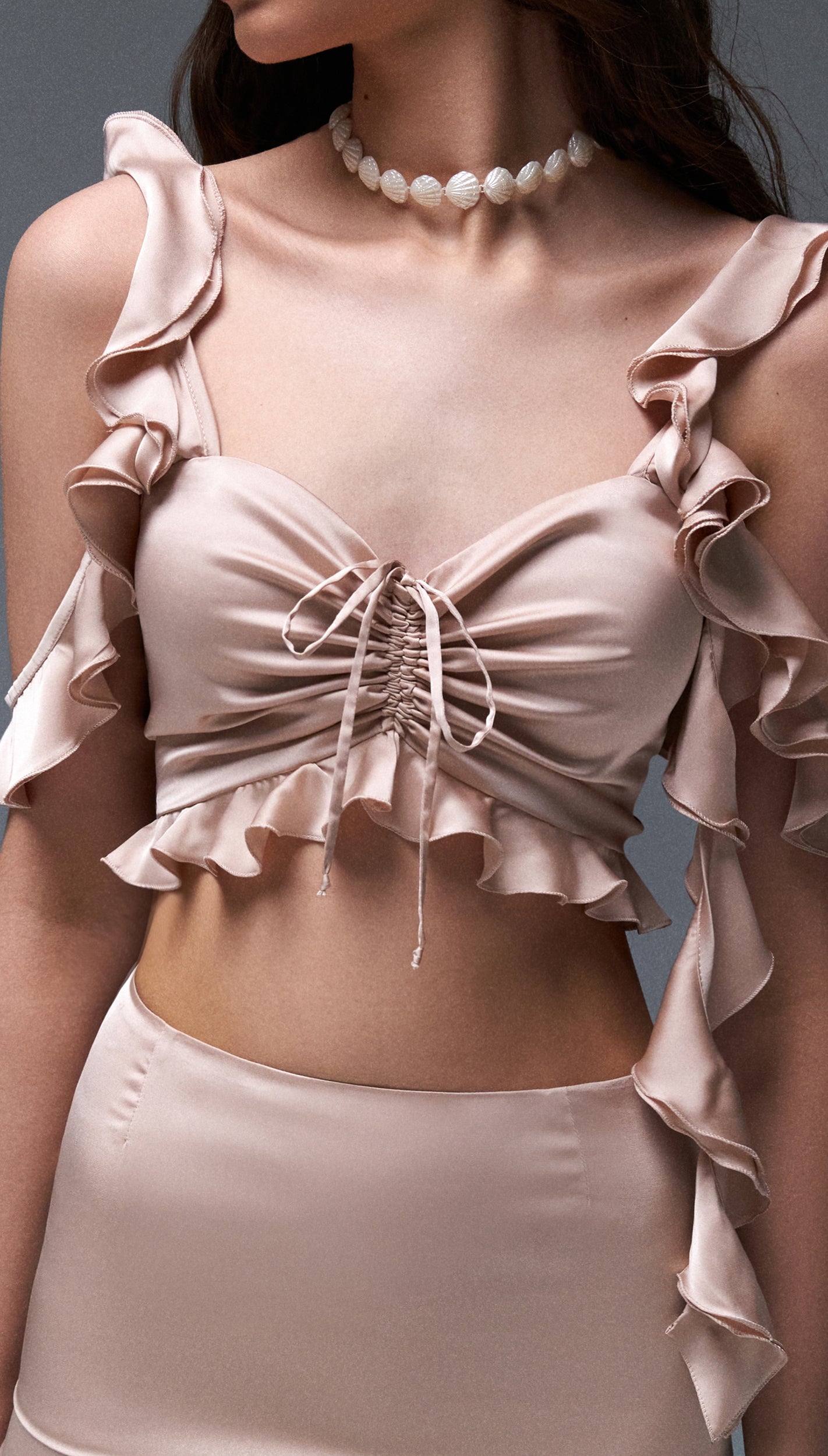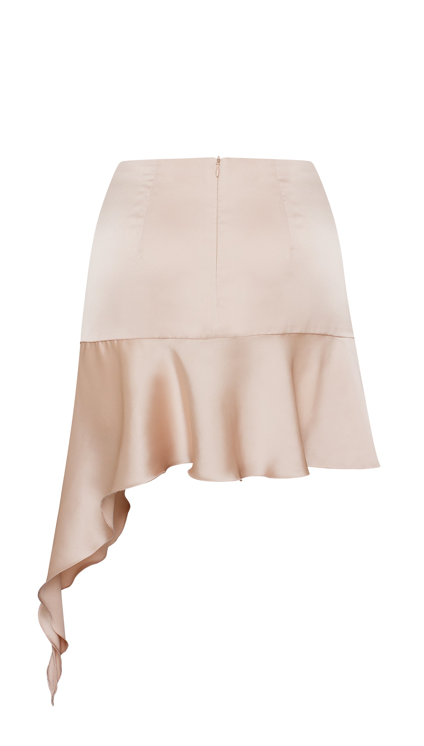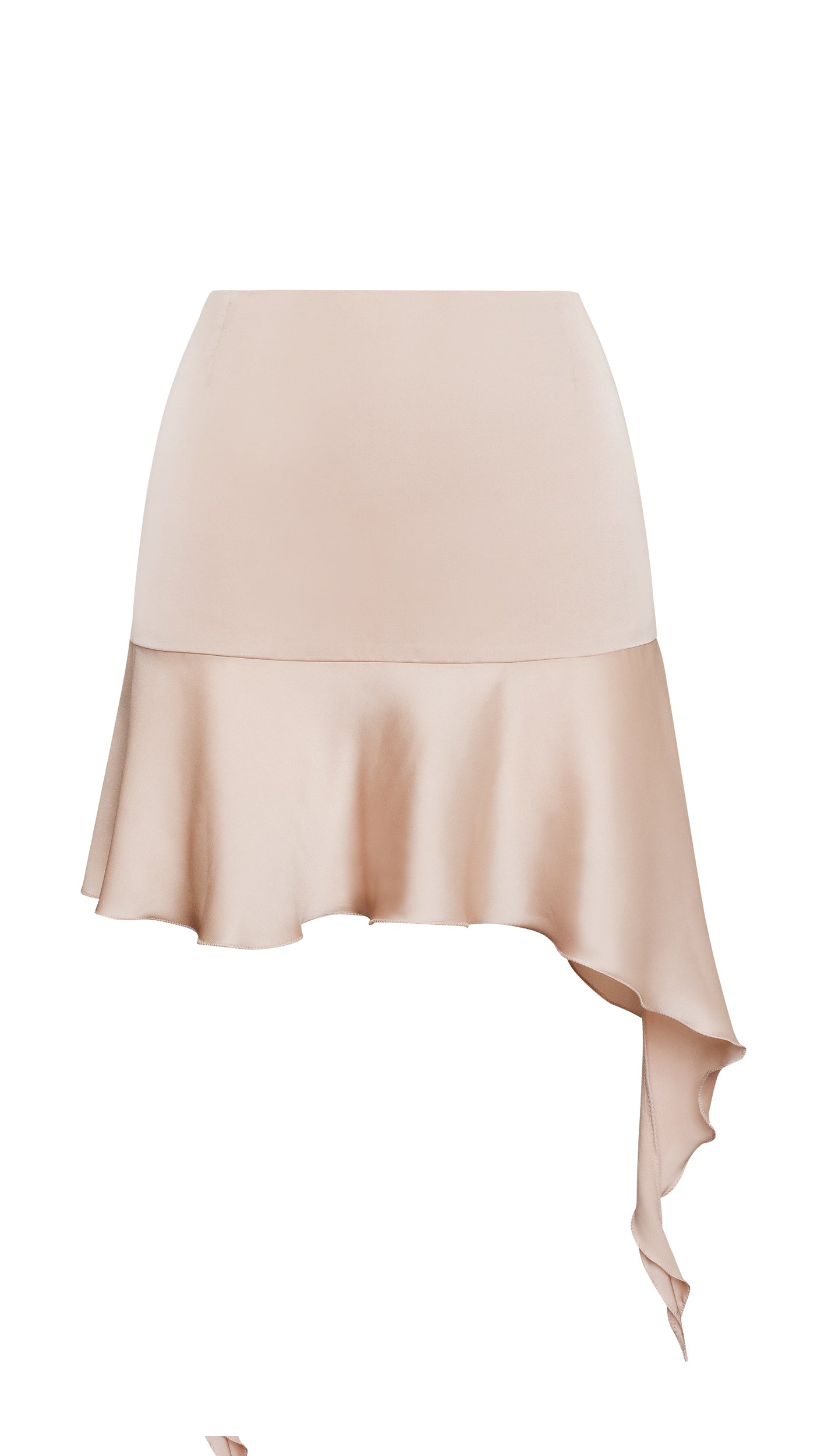 Ця невимушена та унiверсальна спідниця Wave виготовлена з блискучого атласу в кольорі нюд та має кокетлевий асиметричний низ.
