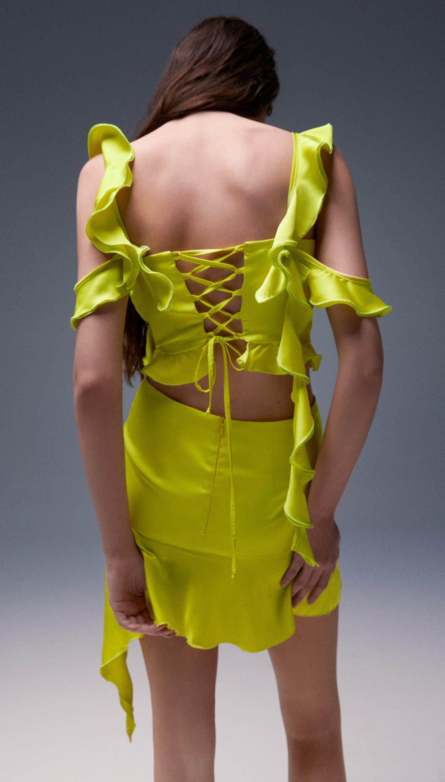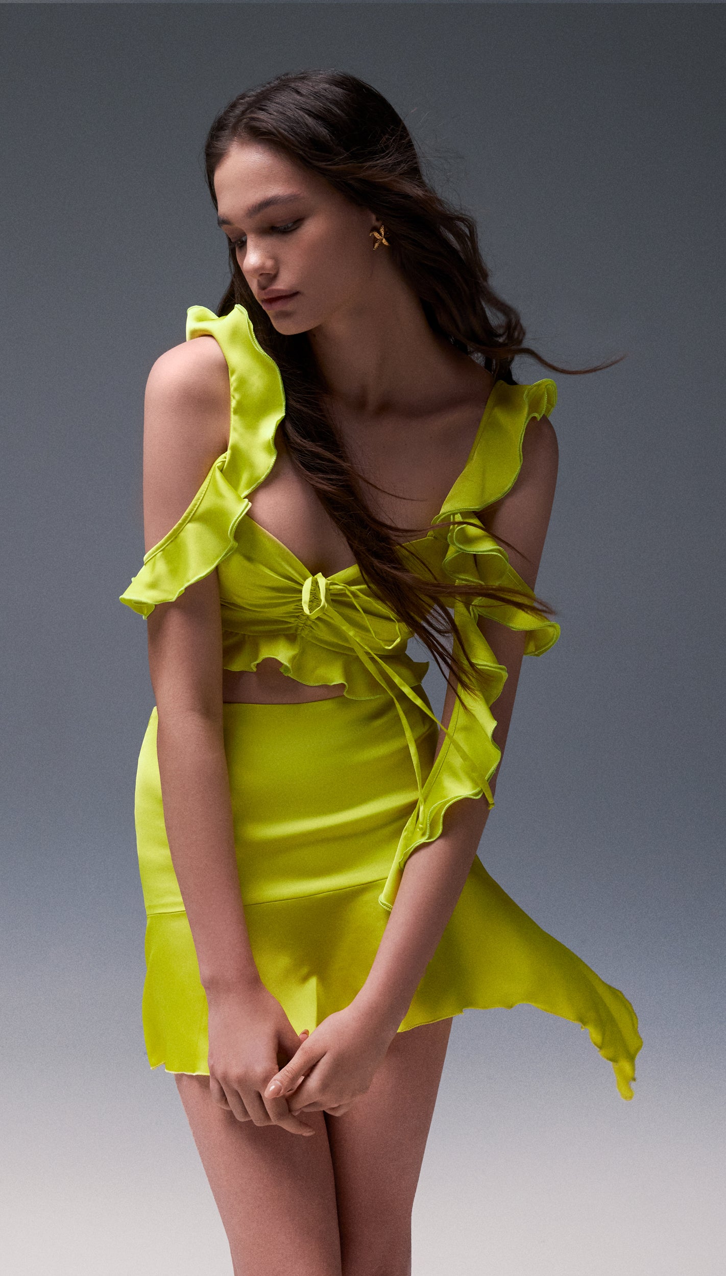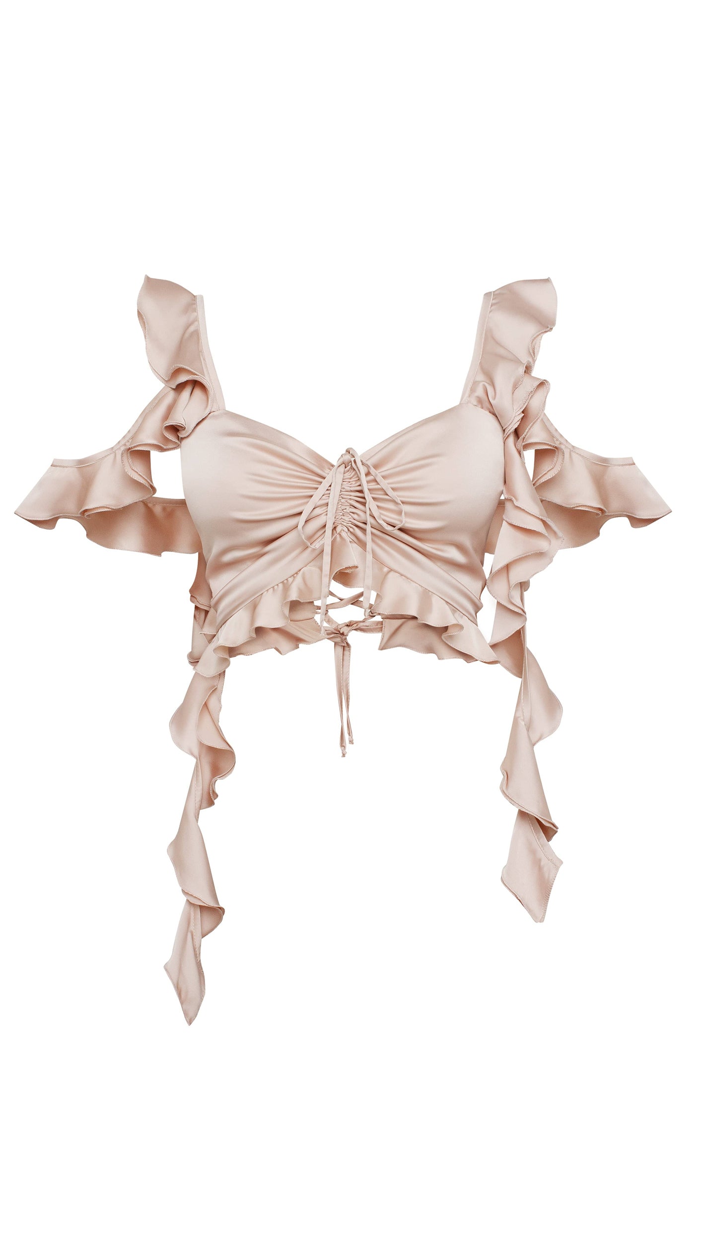 Ця невимушена та унiверсальна спідниця Wave виготовлена з блискучого атласу в кольорі нюд та має кокетлевий асиметричний низ.